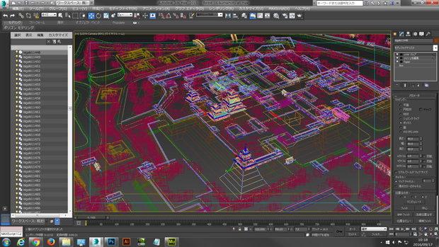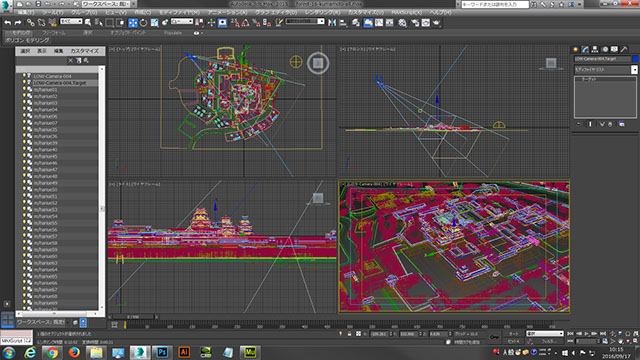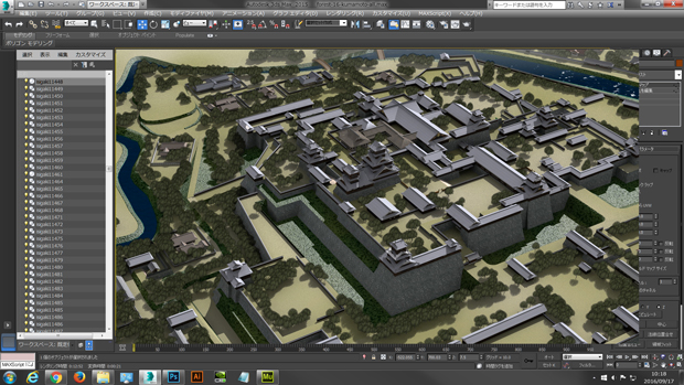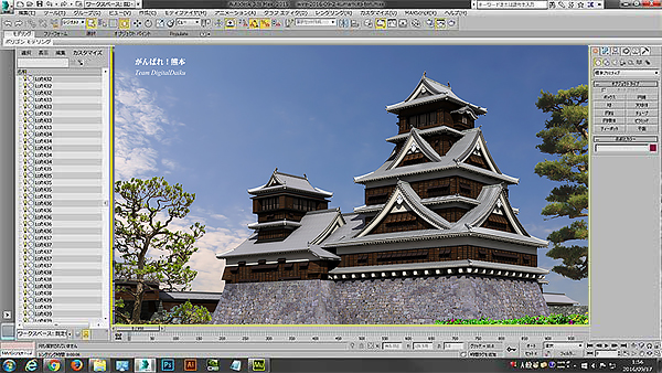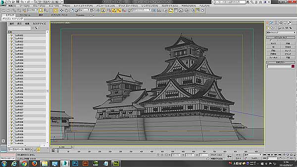 DigitalDaikuの3次元城郭データがあれば、このプロセスは省略できます。時代背景や、復元時期に応じて簡単な修正や、照明設定、程度の作業ですぐにレンダリングプロセスに移行できます。